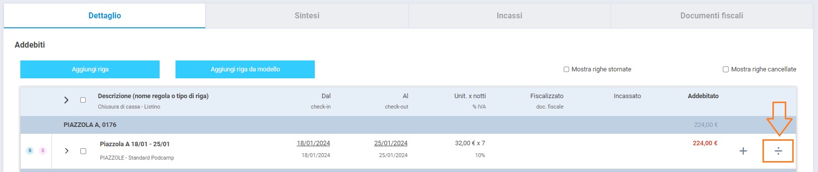 Passando il cursore del mouse, sulle righe degli addebiti, potremmo notare il simbolo “÷”.