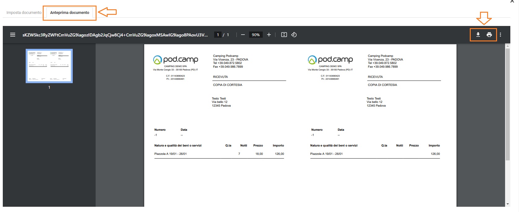 Cliccandovi sopra si aprirà un’anteprima con il PDF della ricevuta proforma/fattura che state per emettere e che potrete visualizzare ed eventualmente stampare attraverso i pulsanti che trovate.