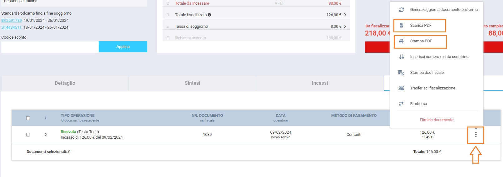 Inoltre una volta emessa la ricevuta proforma, questa la trovate anche nella tab documenti fiscali, dai tre puntini utilizzando la funzione “Scarica pdf” oppure “Stampa pdf” se la stampante è configurata.