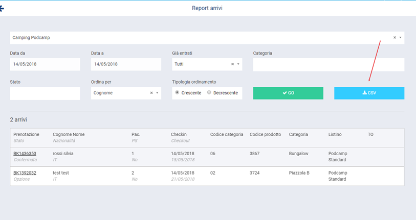 E’ un report molto operativo e serve per gestire gli arrivi in struttura. E’ possibile indicare un periodo o anche un singolo giorno: la ricerca mostra tutte le prenotazioni in arrivo in quelle date (in qualsiasi stato si trovino).