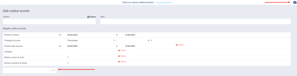 I codici sconto possono essere creati alla voce di menu Configurazione ⇒ Pricing ⇒ Codici sconto. Con il + in alto sulla destra, si aprirà una tab da completare nelle sue parti a seconda del tipo e del periodo di utilizzo che si vogliono attribuire al voucher sconto.