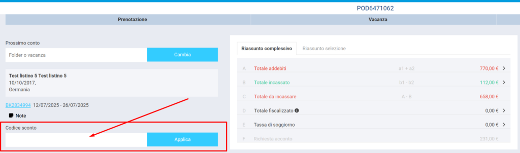 Dopo aver generato la nuova prenotazione, andare nel suo conto e nel campo “CODICE SCONTO” inserite il codice generato in precedenza ⇒ cliccare sul bottone APPLICA.