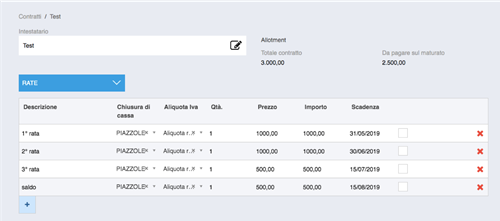 La sezione RATE permette di gestire le rate che potrebbero comporre il di un Tour Operator: è possibile inserire le scadenze dei pagamenti e i relativi importi.