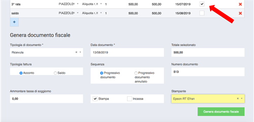 Una volta compilati i campi e salvato, è possibile selezionare la riga e generare il documento fiscale nel momento in cui ne ricevete il pagamento.
