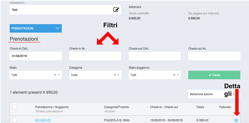 Qui è possibile effettuare ricerche per filtri: una volta ricercate le prenotazioni possiamo vederne i dettagli cliccando sull’icona a destra in fondo alla riga corrispondente alla prenotazione.