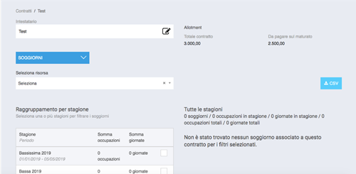 Nella sezione SOGGIORNI è possibile estrarre la lista dei soggiorni legati al contratto divisi per singolo prodotto ed eventualmente filtrati per Stagione.