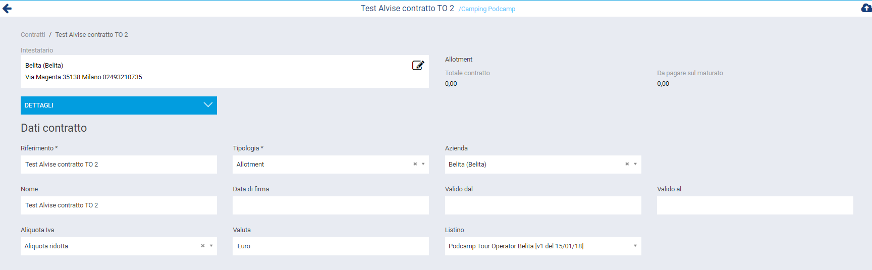 Anche se questa sezione è più spesso utilizzata per i Contratti STAGIONALI può essere utilizzata anche per i contratti Tour Operator qualora non venga creato ed associato un Listino di tipo Tour Operator al contratto.