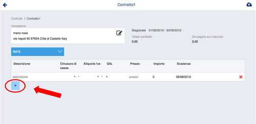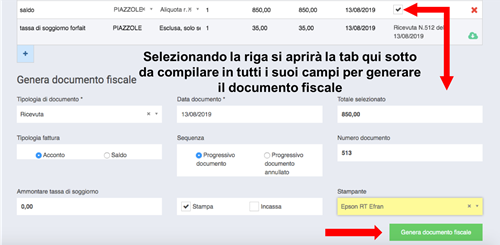 La sezione RATE permette di gestire le rate che solitamente compongono il pagamento di uno stagionale: una volta compilati i campi e salvato, è possibile selezionare la riga e generare il documento fiscale nel momento in cui ricevete il pagamento della stessa. Il documento è successivamente scaricabile direttamente da questa stessa interfaccia ⇒ cliccare sulla nuvoletta verde.