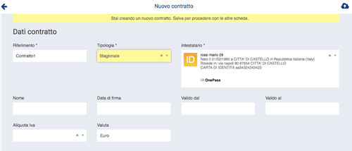 Inserire successivamente la TIPOLOGIA, in questo caso appunto “stagionale” ⇒ si attiverà il campo “intestatario” dove inserire l’anagrafica appunto dell’intestatario del contratto.