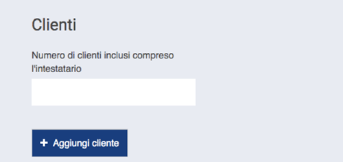 CLIENTI ⇒ Numero di clienti inclusi compreso l’intestatario ⇒ qui verranno inserite le anagrafiche di tutti i componenti appartenenti al contratto. NON va inserito anche il nome dell’intestatario del contratto, ma questo deve essere considerato nel valore da inserire nel campo “Numero di clienti inclusi compreso l’intestatario”. Quindi se le persone del contratto sono una famiglia di 5 persone (compreso l’intestatario del contratto) il campo deve contenere il valore 5, ma vanno inserite solo 4 anagrafiche.