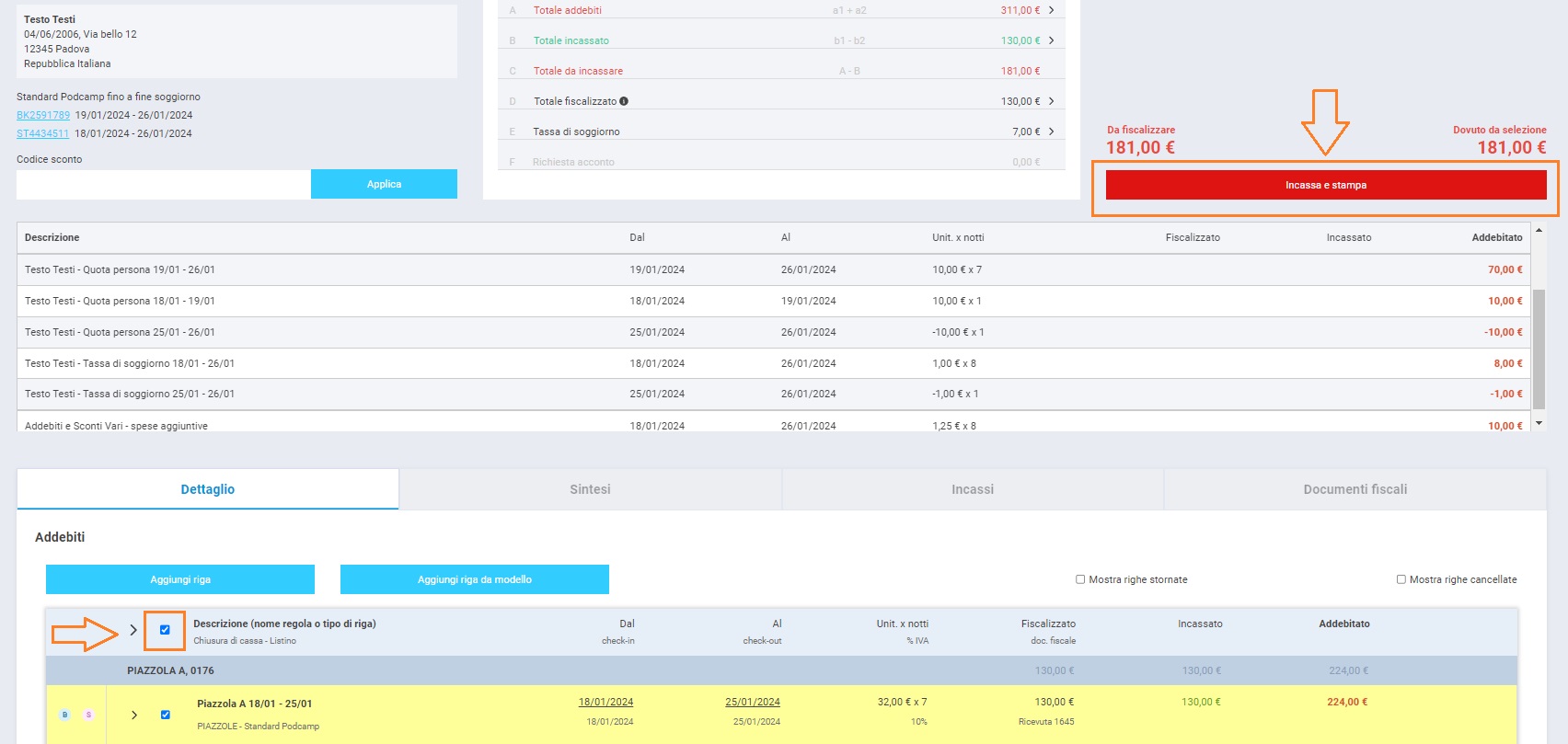 Pertanto potete selezionare tutte le righe del conto → utilizzare il bottone rosso “incassa e stampa” → compilare la sezione dell’incasso (con la possibilità di utilizzare la funzione “descrizione”, dove potrete indicare ad esempio secondo acconto) → nella sezione di sinistra modificare il documento fiscale in fattura → se necessario nella sezione centrale modificare l’intestatario (con un azienda o un’altra persona presente o meno nella vacanza) → in questo modo si genererà la fattura che potrete scaricare dalla tab documenti fiscali, dai tre puntini l’azione “scarica fattura elettronica”.