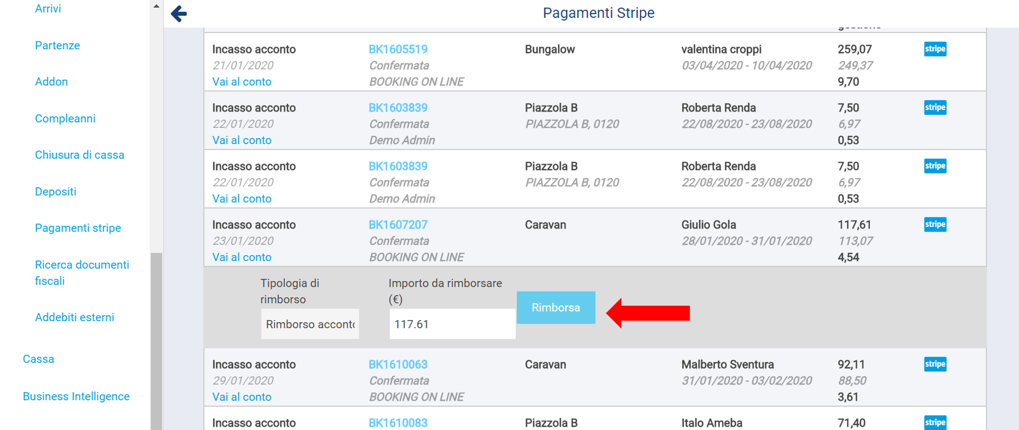 Se il pagamento è avvenuto tramite Stripe, bisogna procedere da Report ⇒ Operativi ⇒ Pagamenti Stripe ⇒ da qui selezionare il pagamento da rimborsare ed effettuarlo con un click.