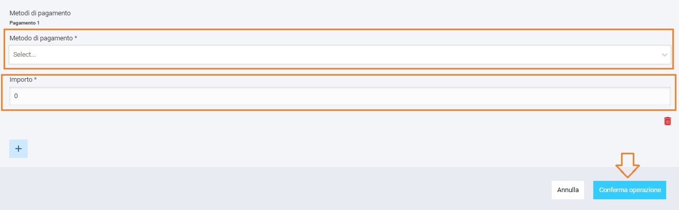 Indicare il metodo di pagamento con il simbolo + e riportare nuovamente l’importo che si desidera rimborsare con il segno – (meno) davanti.