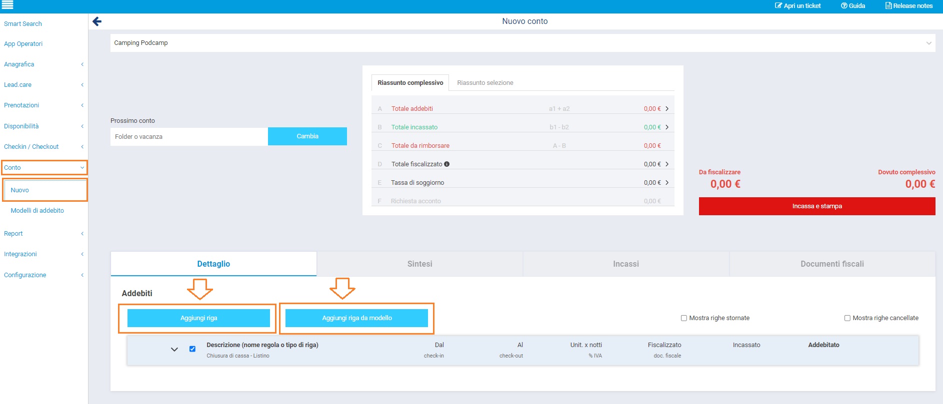 Per effettuare un conto fuori prenotazione dovete accedere dal menu Conto ⇒ Nuovo ⇒ cliccare “Aggiungi Riga” oppure “Aggiungi riga da modello”, indicare la tipologia di riga e inserire i dati nei campi di riferimento.
