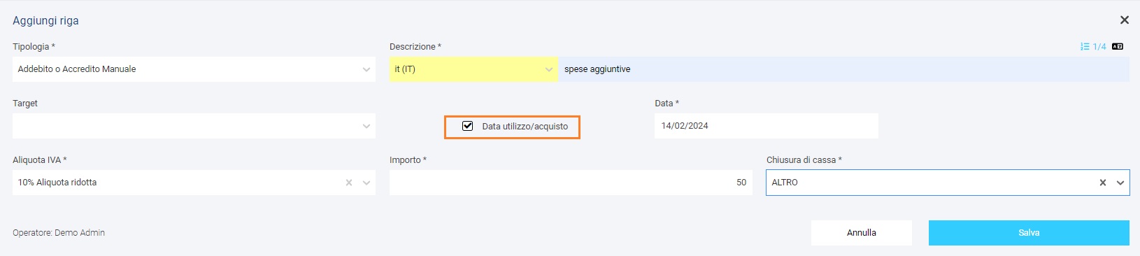 Se viene aggiunta una riga di tipologia “Addebito o accredito manuale”, è possibile definire una sola data di utilizzo/acquisto, fleggando l’apposito quadratino: