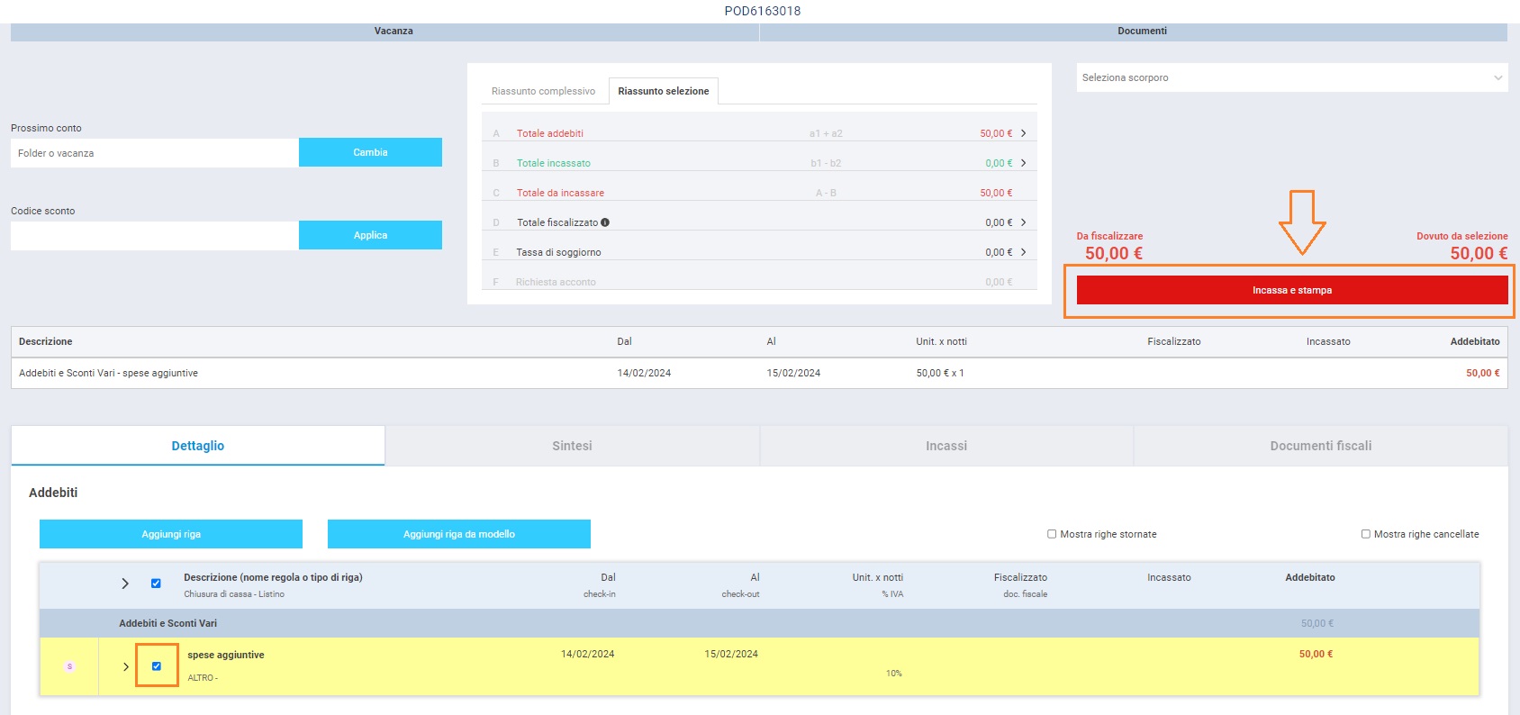 A questo punto, una volta generata la riga o più, selezionarla e cliccare sul bottone rosso “incassa e stampa” ⇒ vi si aprirà l’interfaccia per emettere il documento fiscale e per poter collegare un’anagrafica/azienda dell’intestatario della ricevuta/fattura.