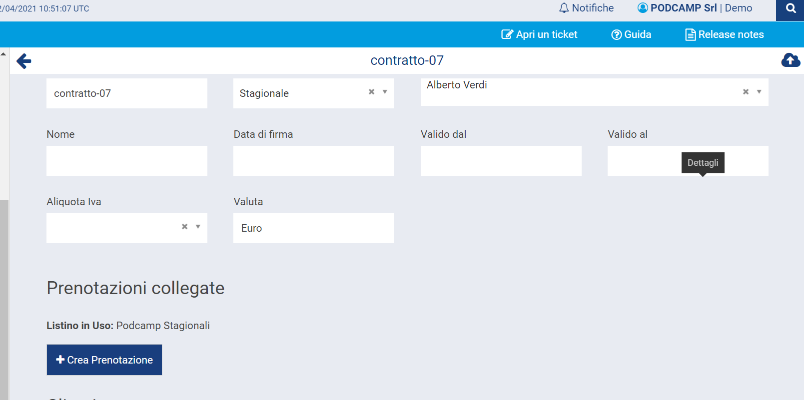 Se ci sono già una o più BK collegate al contratto, al posto del pulsante Crea prenotazione apparirà la lista delle BK (cliccabili).