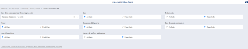 – IMPOSTAZIONI LEAD CARE: qui si inserisce lo stato in cui vogliamo venga creata la prenotazione dopo la scelta del cliente tra le varie proposte presentategli: stato opzione o richiesta di deposito/acconto. Noi suggeriamo la seconda ipotesi, perché in questo modo avete già l’impostazione per potere inviare il modello di richiesta di pagamento dell’acconto o del deposito.