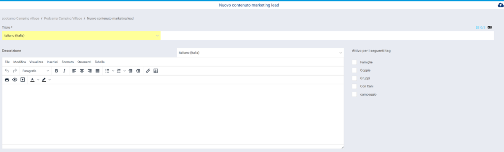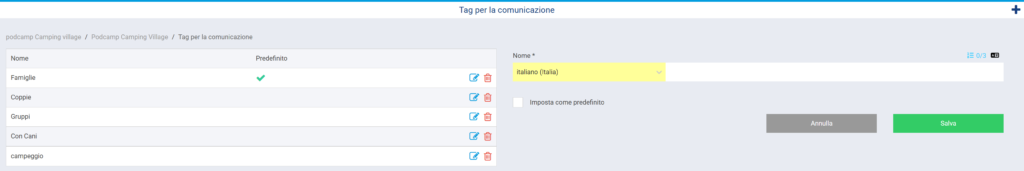 – TAG PER LA COMUNICAZIONE: molto importanti, sono i tag che identificano la tipologia di cliente che verrà in vacanza e faranno in modo che il minisito generato dinamicamente da pod.camp sia coerente con il tag scelto per lui. Usando il pulsante + aggiungi, si dovrà inserire il nome del tag e salvare. E’ possibile inserire un numero illimitato di tag ed è necessario impostare un tag di default, che può comunque sempre essere modificato.