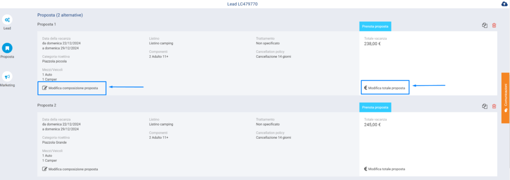 – cliccando su MODIFICA COMPOSIZIONE PROPOSTA modifichiamo la proposta nel contenuto: si apre un oggetto che è la classica interfaccia di prenotazione di pod.camp, dove possiamo agire come siamo abituati, quindi potremmo per esempio aggiungere degli addon per inviare una proposta più completa, o stabilire la politica di cancellazione ed il trattamento per ciascuna proposta. Una volta eseguita la modifica, salviamo l’offerta e torniamo sulla dashboard.