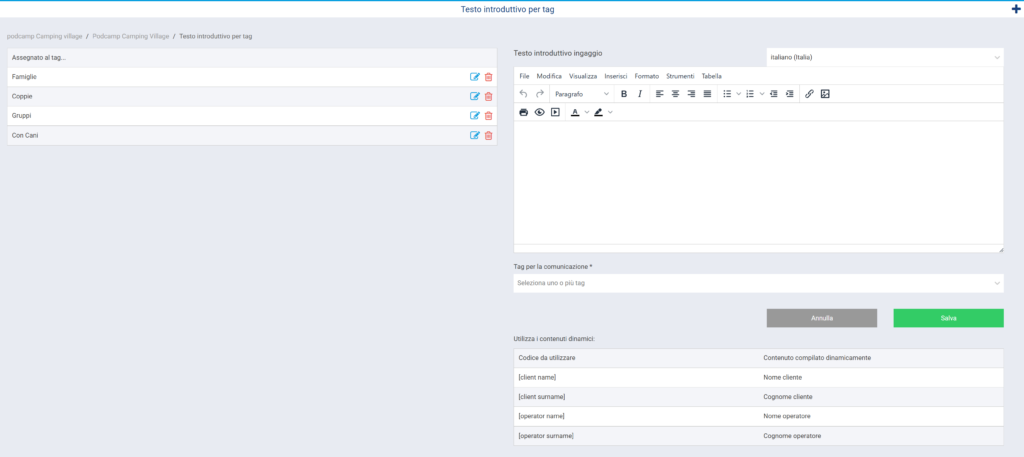 – TESTO INTRODUTTIVO PER TAG: è il testo che il cliente leggerà nel minisito non appena riceverà la vostra prima comunicazione, ed è strettamente legato ai tag inseriti precedentemente. La procedura per aggiungere un nuovo testo è la classica utilizza su pod.camp: clicchiamo sul tasto + aggiungi ⇒ definiamo il testo che viene poi ricopiato all’interno del lead e quindi del minisito, ci associamo uno o più tag e, come vediamo, è possibile inserire dei campi dinamici con i quali il testo identificato viene modificato in maniera dinamica ⇒ salviamo.