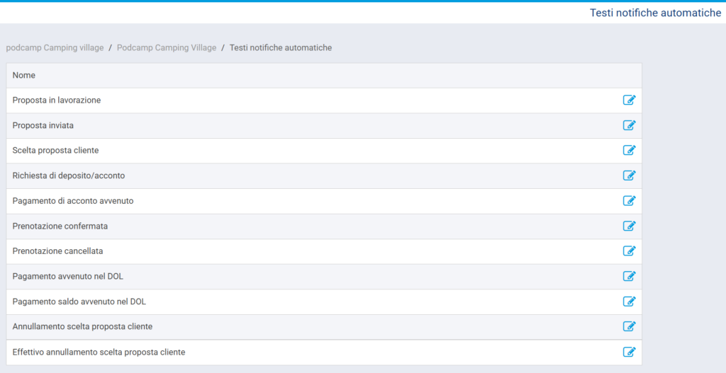 – TESTI NOTIFICHE AUTOMATICHE: è possibile personalizzare i testi che vengono inviati automaticamente ad ogni evento o notificazione al cliente.