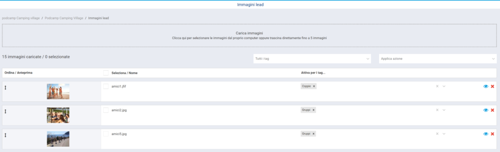 – IMMAGINI LEAD: qui carichiamo immagini, anche multiple, possiamo stabilire e cambiare l’ordine delle immagini spostandole con un trascinamento delle stesse e, cliccando sull’icona dell’occhio, possiamo visualizzare un’anteprima delle immagini che vedrà il cliente sul suo minisito. Se selezioniamo una immagine, possiamo decidere di modificare i tag ad essa associati, oppure dal menu “applica azione” possiamo assegnare un tag, cancellarlo oppure cancellare del tutto l’immagine.