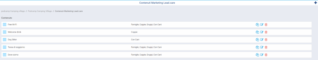 – CONTENUTI MARKETING LEAD CARE: sono delle sezioni che possono essere incluse o meno nelle proposte, quindi si tratta di contenuti aggiuntivi legati ai tag, tutti inseribili con delle preselezioni. Solita procedura per l’inserimento: clicchiamo sul + aggiungi ⇒ inseriamo il titolo e il testo del contenuto ⇒ salviamo.