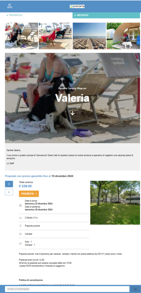 Il minisito è una sezione del booking online integrato graficamente con il vostro sito web. Qui il cliente può leggere i messaggi (e rispondervi) ma può anche andare a leggere i preventivi che gli verranno inviati.
