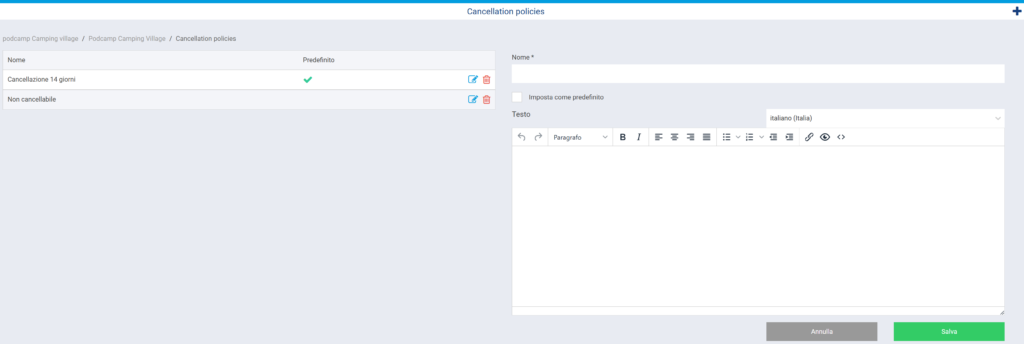 – CANCELLATION POLICIES: è possibile inserire diverse politiche di cancellazione, e ognuna può essere legata indipendentemente a ciascuna proposta.