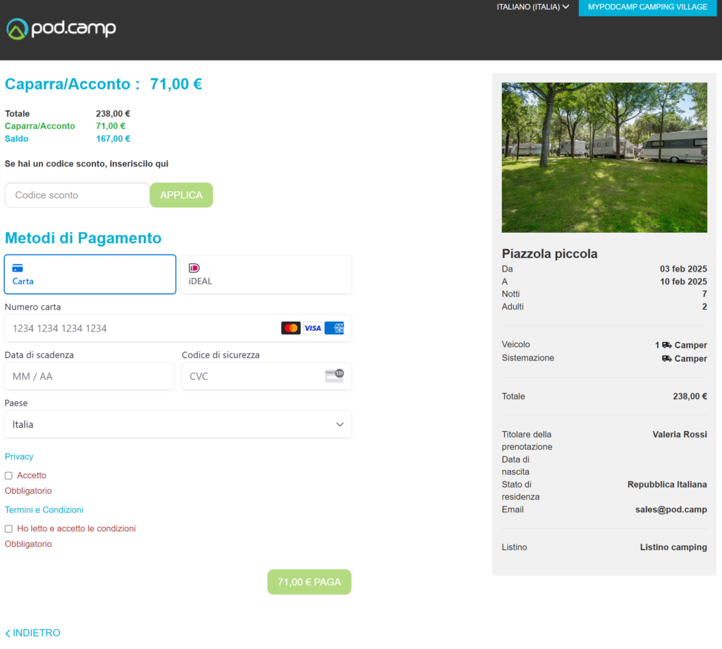 Il cliente pagherà attraverso le modalità già previste dal sistema, sia per il pagamento dell’acconto o del deposito, che successivamente per il saldo.