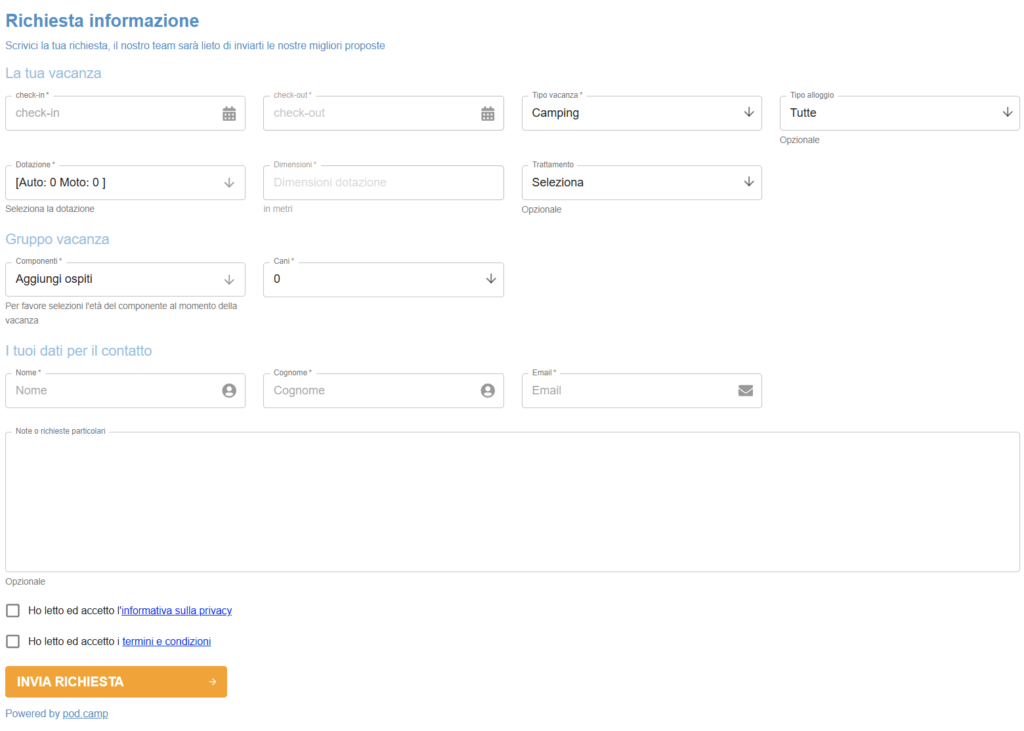 Nel form che verrà inserito sul vostro sito, come detto prima, come obbligatorie chiederemo solamente le seguenti informazioni: il periodo di vacanza, la tipologia di vacanza, i dati anagrafici essenziali.