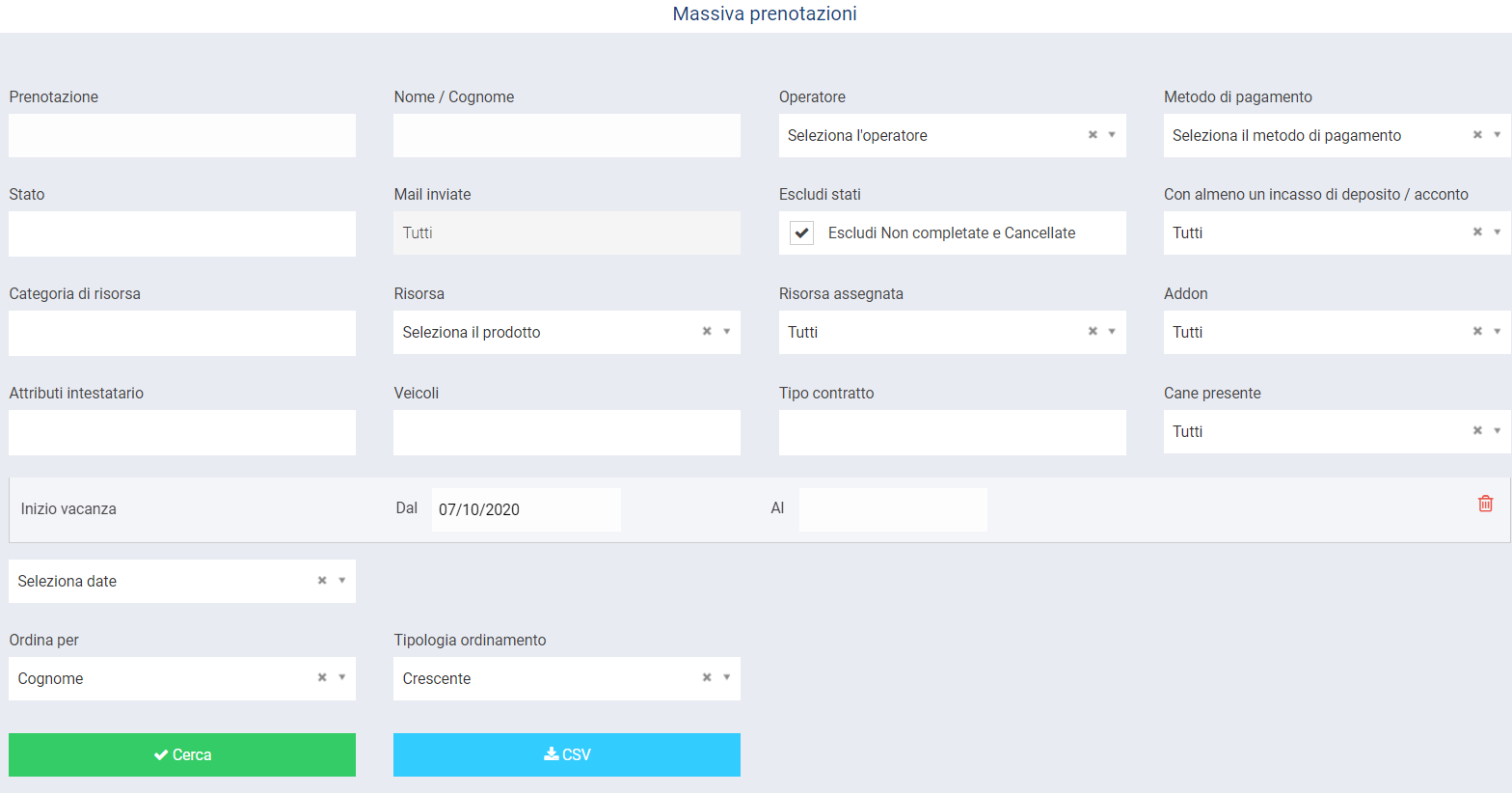 Consigliamo di utilizzare la funzionalità nominata Ricerca quando l’obiettivo è estrarre dati sulle prenotazioni (anche quelle che hanno generato soggiorni) e la Massiva solo quando dovete effettuare invii multipli di mail, cambi di stato massivi o inserimenti multipli di incassi deposito.