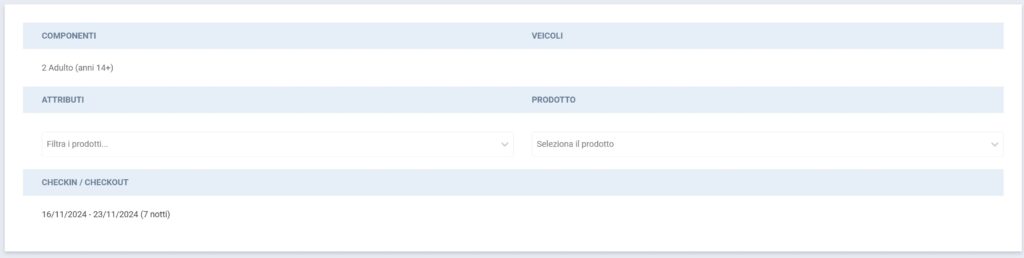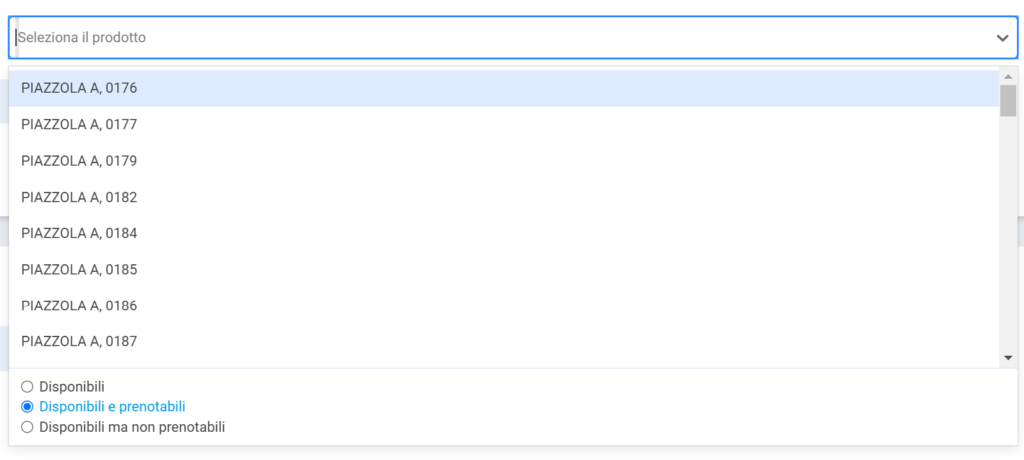 - PRODOTTO ⇒ La possibilità di selezionare un prodotto specifico (è possibile renderlo obbligatorio per la compilazione della prenotazione da parte dell’operatore, in gestione struttura alla voce “Impostazioni prenotazioni”) e stabilendo quale lista di prodotti si vogliono visualizzare tra DISPONIBILI (tutti i prodotti liberi), DISPONIBILI E PRENOTABILI (soltanto i prodotti resi “prenotabili”), DISPONIBILI MA NON PRENOTABILI (prodotti non occupati, ma resi “non prenotabili”).