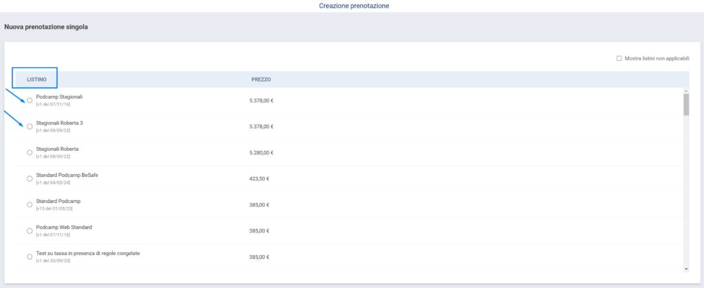 Selezionando la funzione “mostra listini non applicabili”, è possibile visionare tutti quei listini che, per diversi motivi, non sono applicabili nel periodo inserito per la ricerca di disponibilità della vacanza, ad esempio un listino “speciale settembre” mentre noi stiamo ricercando disponibilità per il mese di luglio.