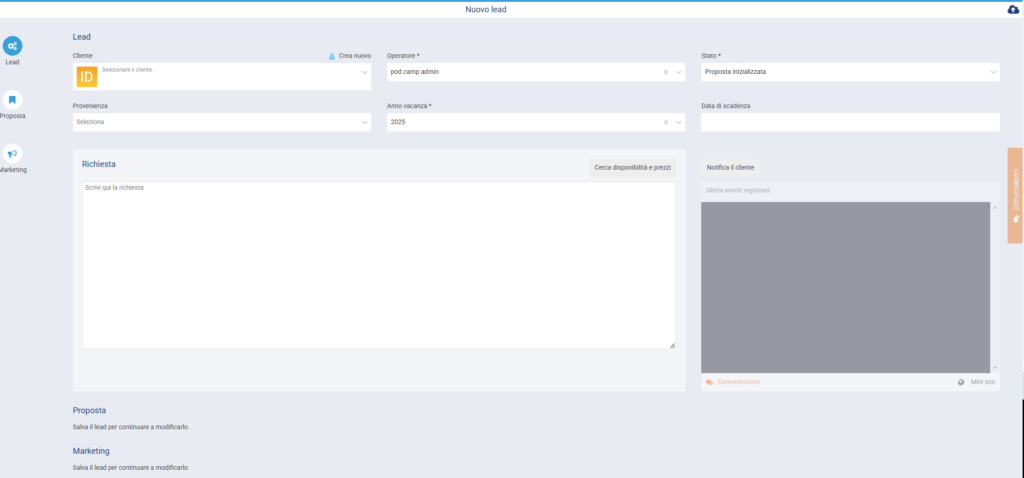 Sulla destra, nella sezione COMUNICAZIONE, troviamo uno storico di tutte le comunicazioni che sono state registrate in merito al lead. Inoltre, cliccando sul pulsante arancione possiamo vedere tutti gli eventi che avvengono durante la gestione di una proposta, tutti i messaggi inviati dal cliente ed è inoltre possibile inserire un messaggio di risposta.