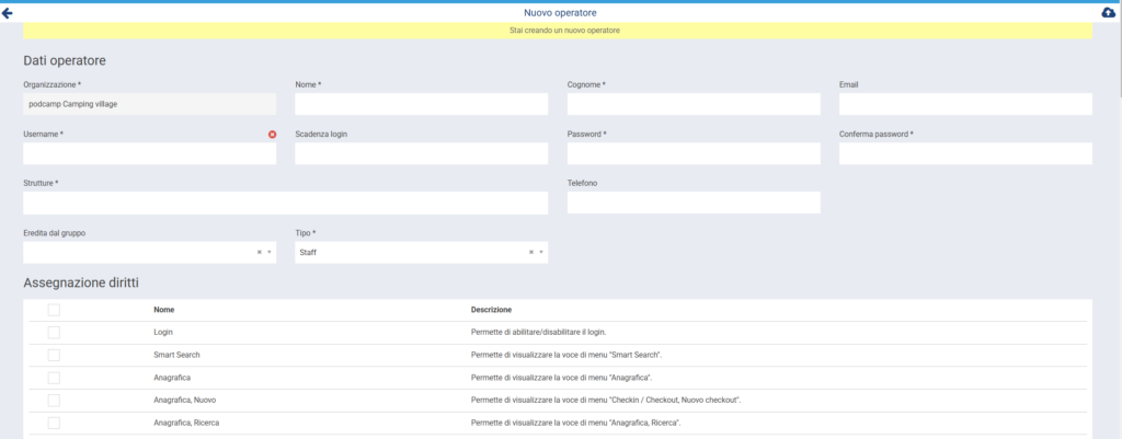 L’utente amministratore ha la facoltà di creare un numero illimitato di OPERATORI, assegnando loro determinati diritti in base alle loro mansioni in campeggio.