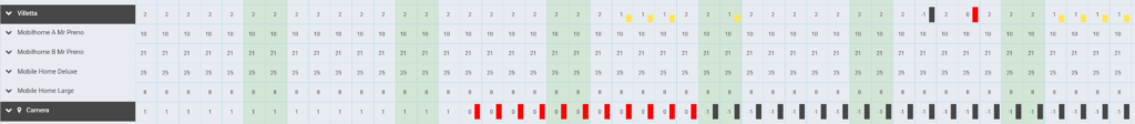 Il tableau, nella versione compatta, ti permette di verificare lo stato di occupazione delle singole categorie di prodotti ricettivi giorno per giorno attraverso le dimensioni e i colori degli istogrammi che rappresentano l’occupazione delle categorie e che segnalano anche il numero esatto di prodotti disponibili.
