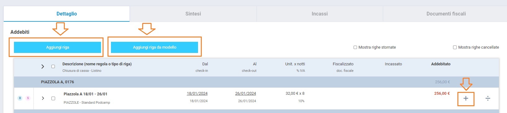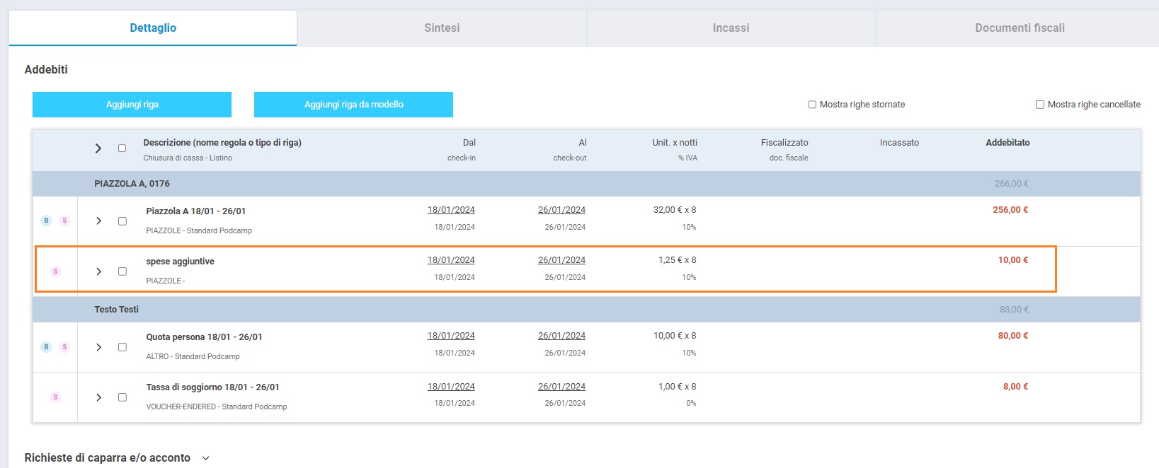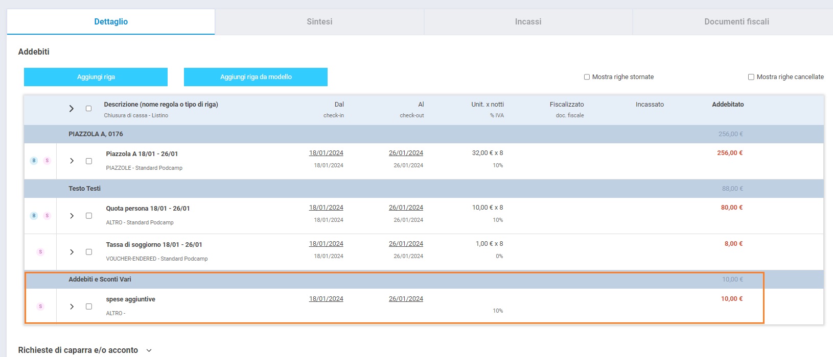 Nella sezione CONTO della nostra prenotazione, clicchiamo su AGGIUNGI RIGA.
