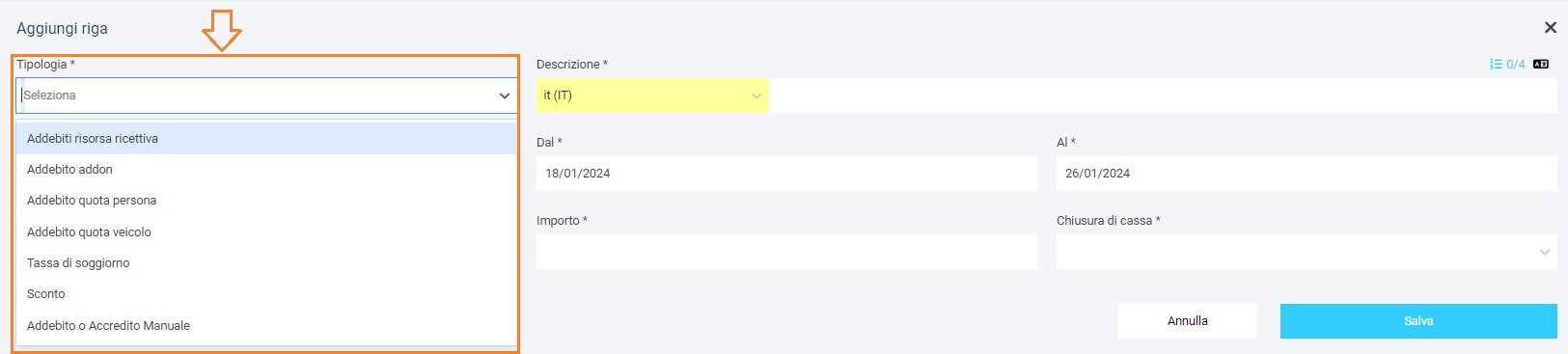 È possibile inserire una descrizione (la quale verrà visualizzata dal cliente), il target, l’aliquota IVA, l’importo e la chiusura di cassa.