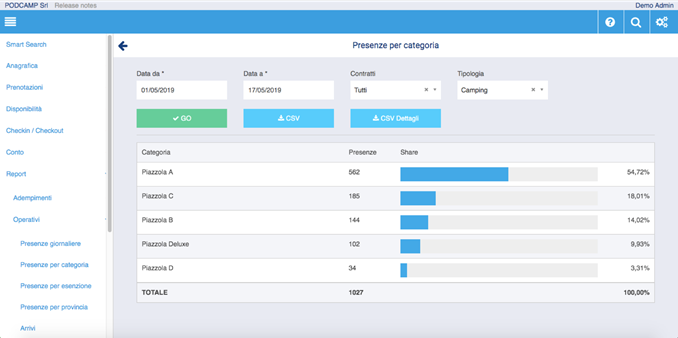 Questo report permette di visualizzare le presenze per categoria. E’ possibile applicare una serie di filtri: per contratto (quindi per esempio permette di elaborare tutte le prenotazioni provenienti da un TO), o/e anche per tipologia (camping o village), per una data specifica o per un periodo di tempo.