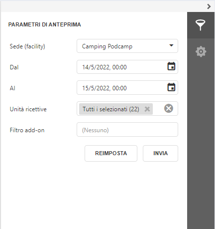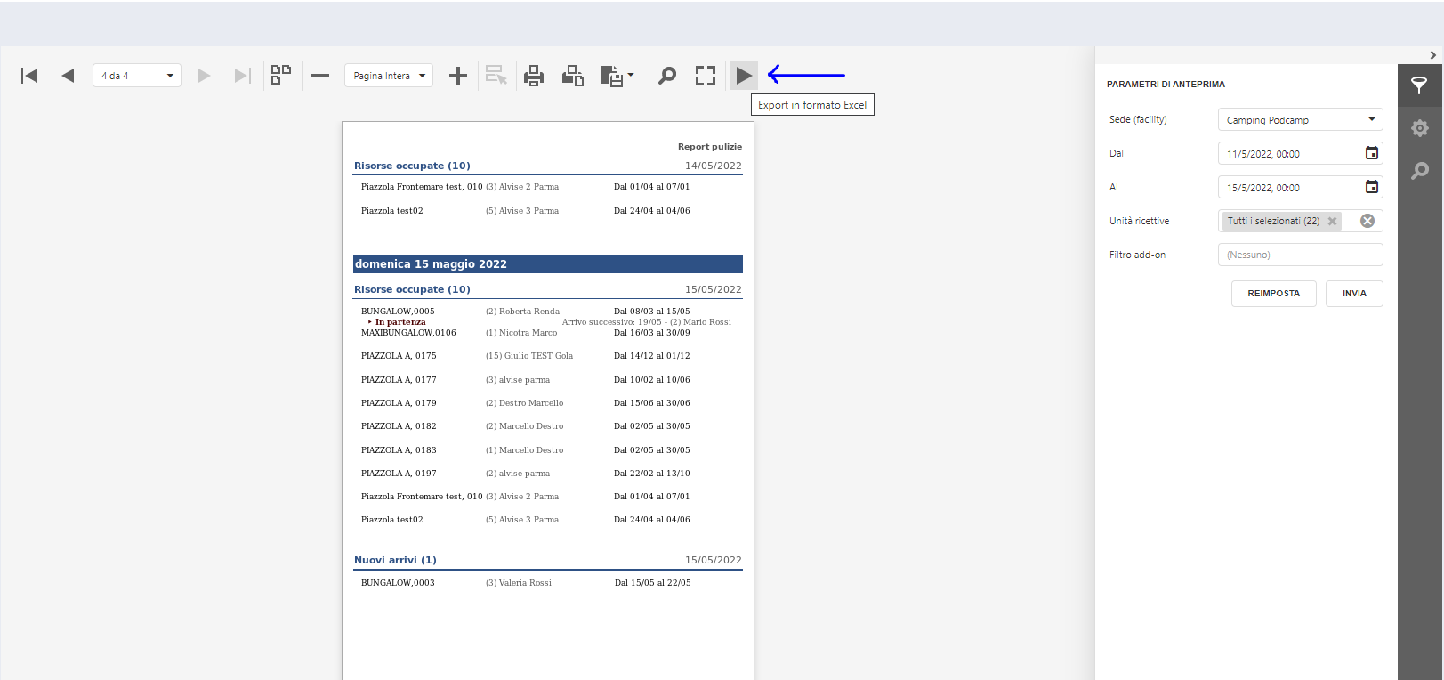 Il report è utile anche a fini organizzativi non necessariamente legati alle pulizie, soprattutto per la possibilità di filtrare per qualsiasi addon configurato su pod.camp.