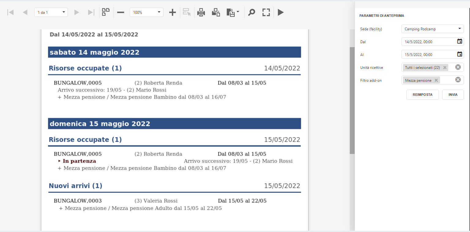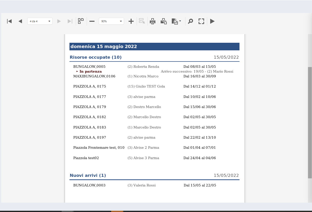 Per entrambe le sezioni, i dati restituiti nel documento prodotto in interfaccia, riportano il nome del prodotto, nome e cognome dell’intestatario/capogruppo preceduto dal numero di componenti della vacanza tra parentesi, date di inizio e fine della vacanza in questione.