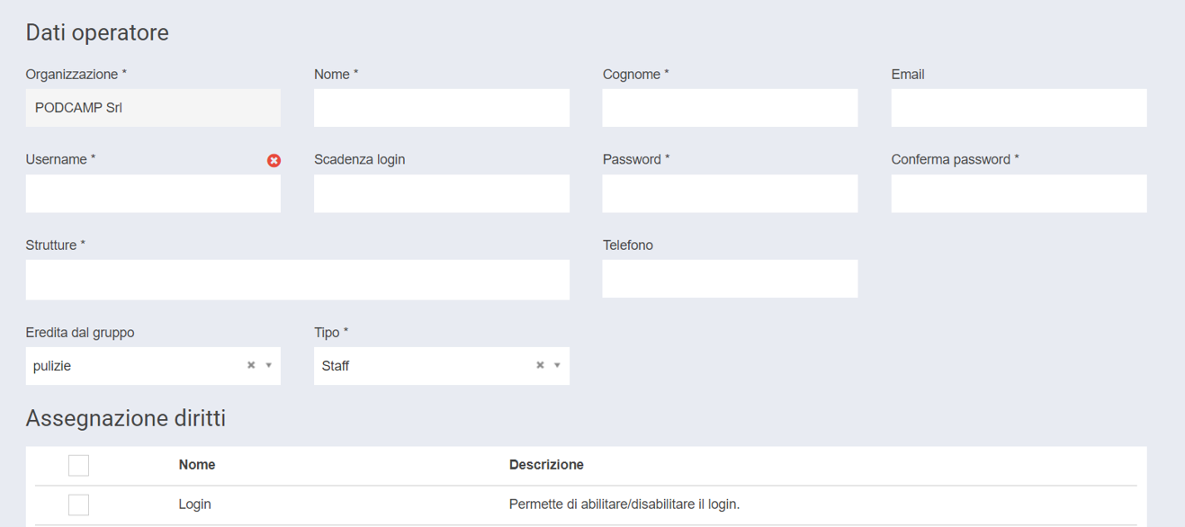 Dal menù di pod.camp ⇒ Configurazione ⇒ Operatori ⇒ Nuovo operatore ⇒ potrete creare il nuovo utente.