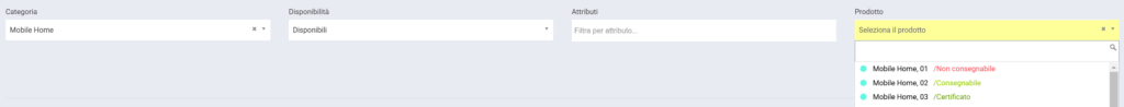 Il menu disponibilità Real Time ha diversi filtri di ricerca, come Tipologia, categoria e prodotto.