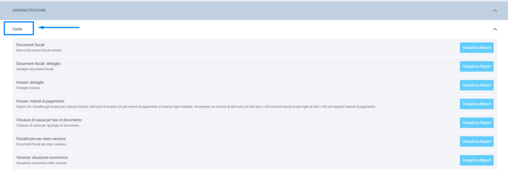 – Stato incassi: Report per mostrare lo stato di fiscalizzazione e le caratteristiche degli incassi.