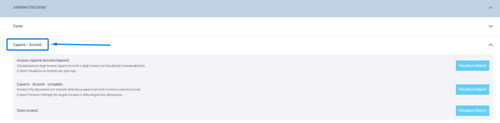 – Caparre – Acconti – completo: Suddiviso pere fiscalizzazioni; lo scarico caparre/acconti; incassi/rimborsi relativi a caparre/acconti; incassi/rimborsi non relativi a caparre/acconti.