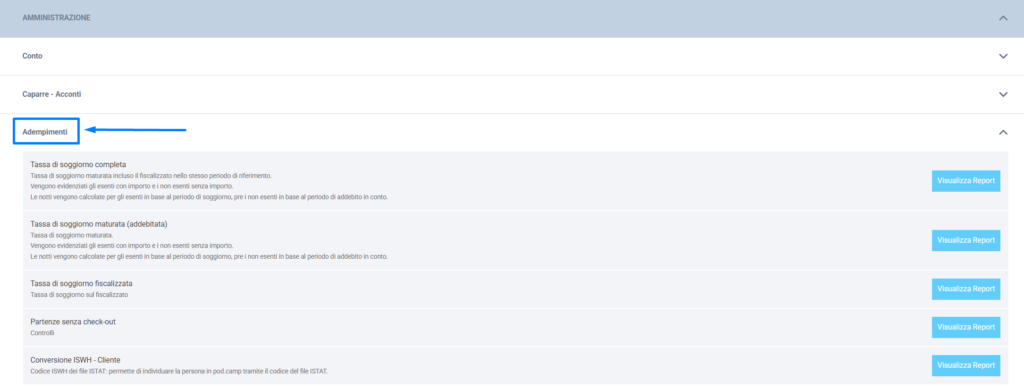 – Tassa di soggiorno completa: Tassa di soggiorno maturata incluso il fiscalizzato nello stesso periodo di riferimento. Vengono evidenziati gli esenti con importo e i non esenti senza importo.