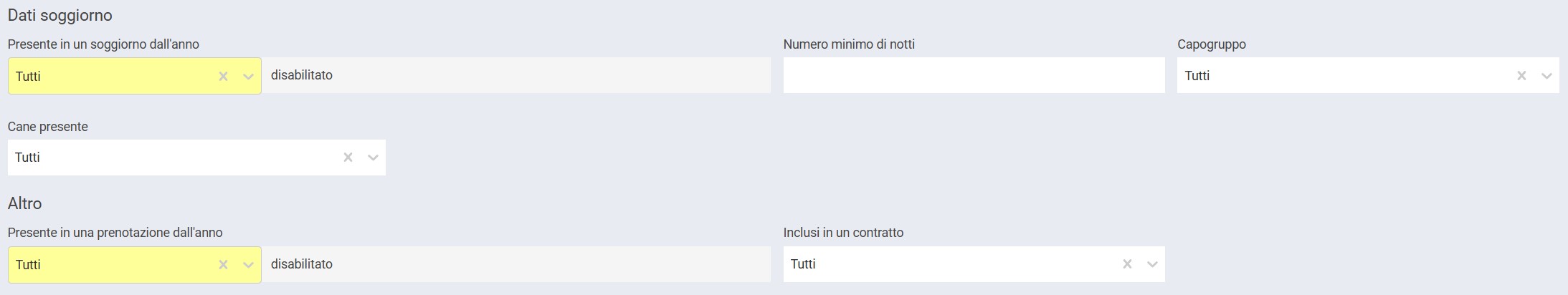 Sono possibili ricerche avanzate attraverso l’impostazione di parametri relativi ai soggiorni e alle prenotazioni, come ad esempio tutti i capigruppo che sono venuti in campeggio negli ultimi 3 anni.