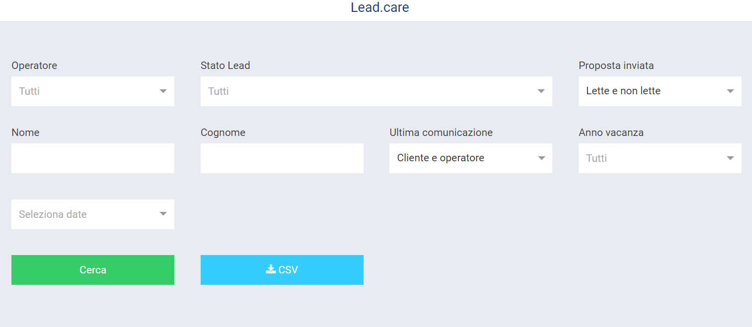 Nella sezione RICERCA ci è possibile utilizzare tutti i filtri previsti per effettuare ricerche mirate in riferimento ai lead.